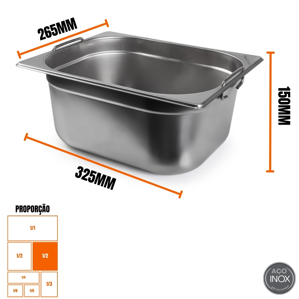 Dimensões externas: 32,5 × 26,5 cm (padrão gastronômico GN 1/2)