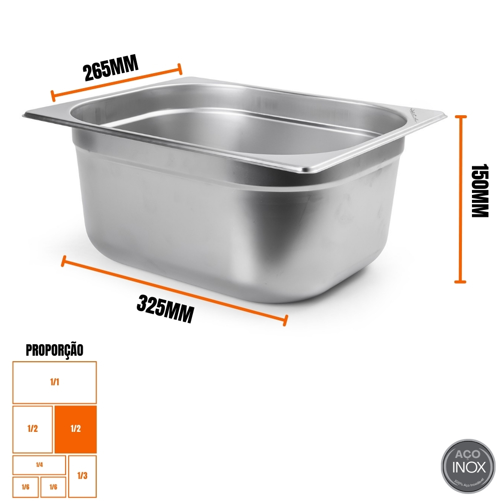 Dimensões externas:32,5 × 26,5 cm (padrão gastronômico GN 1/2)