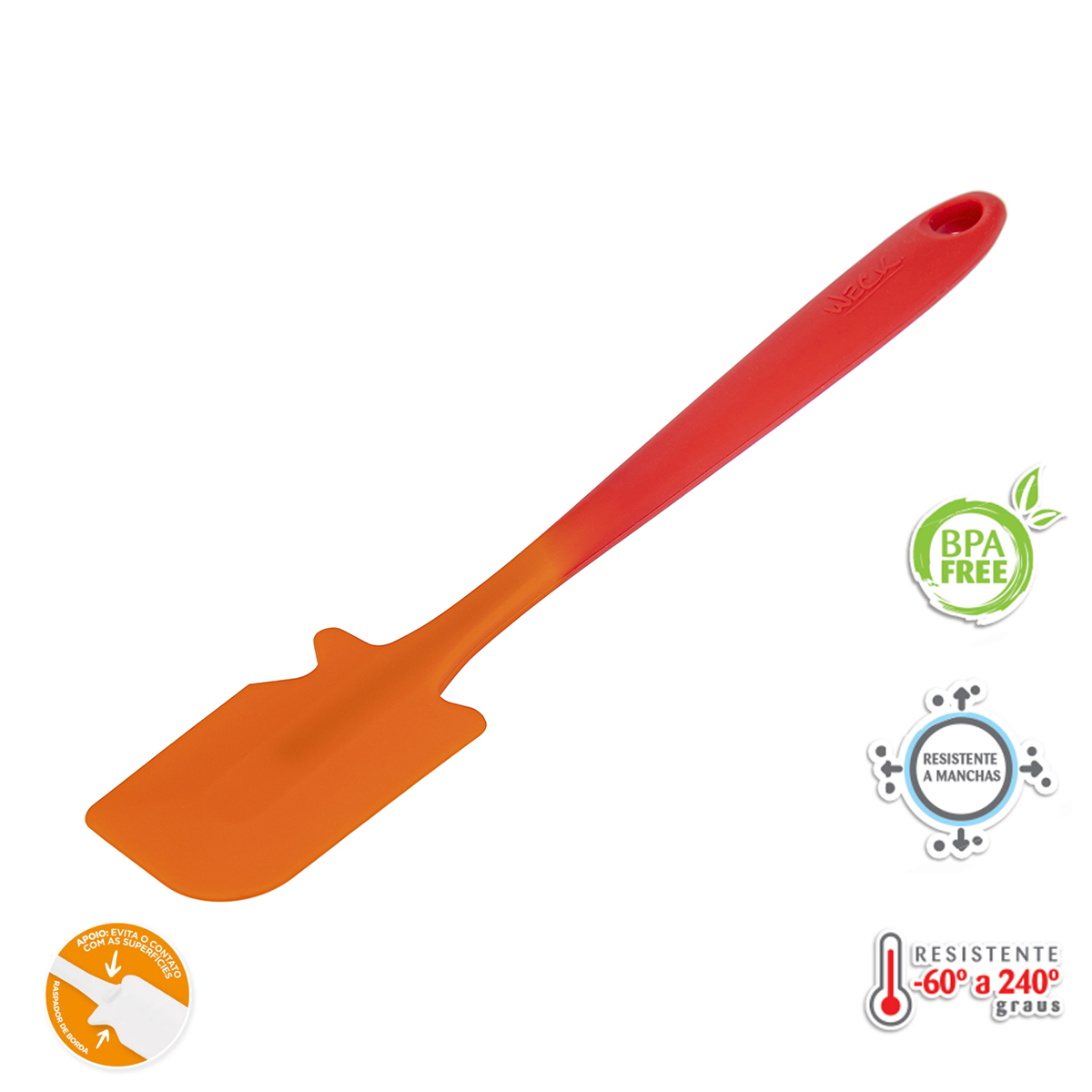 O produto foi completamente desenvolvido para melhor resultado e conforto na hora de cozinha, por isso ele vem equipado com um apoio que evita o contato com o as superfícies e com um raspador de bordas.