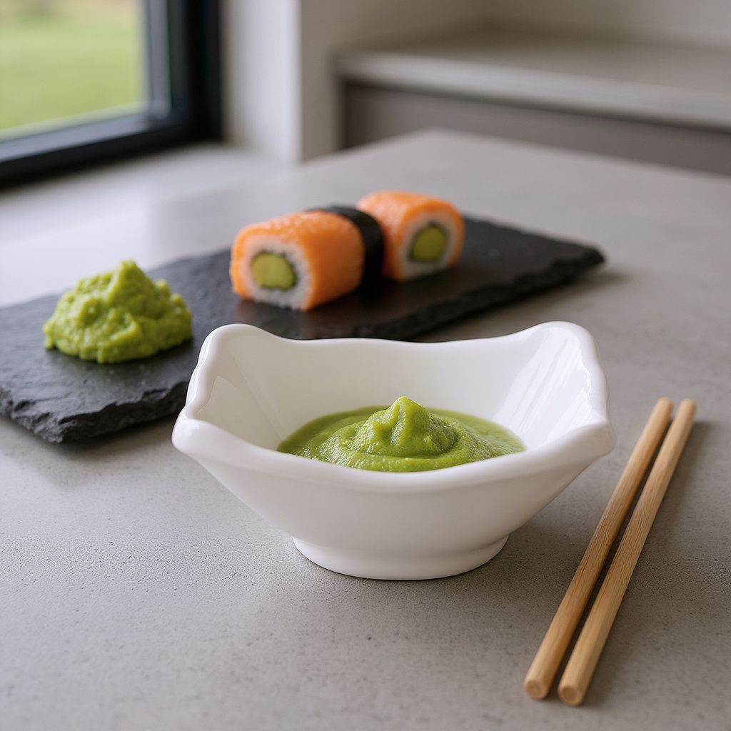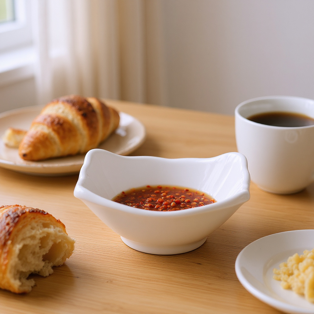 Visual branco que valoriza molhos, acompanhamentos, sobremesas e porções individuais.