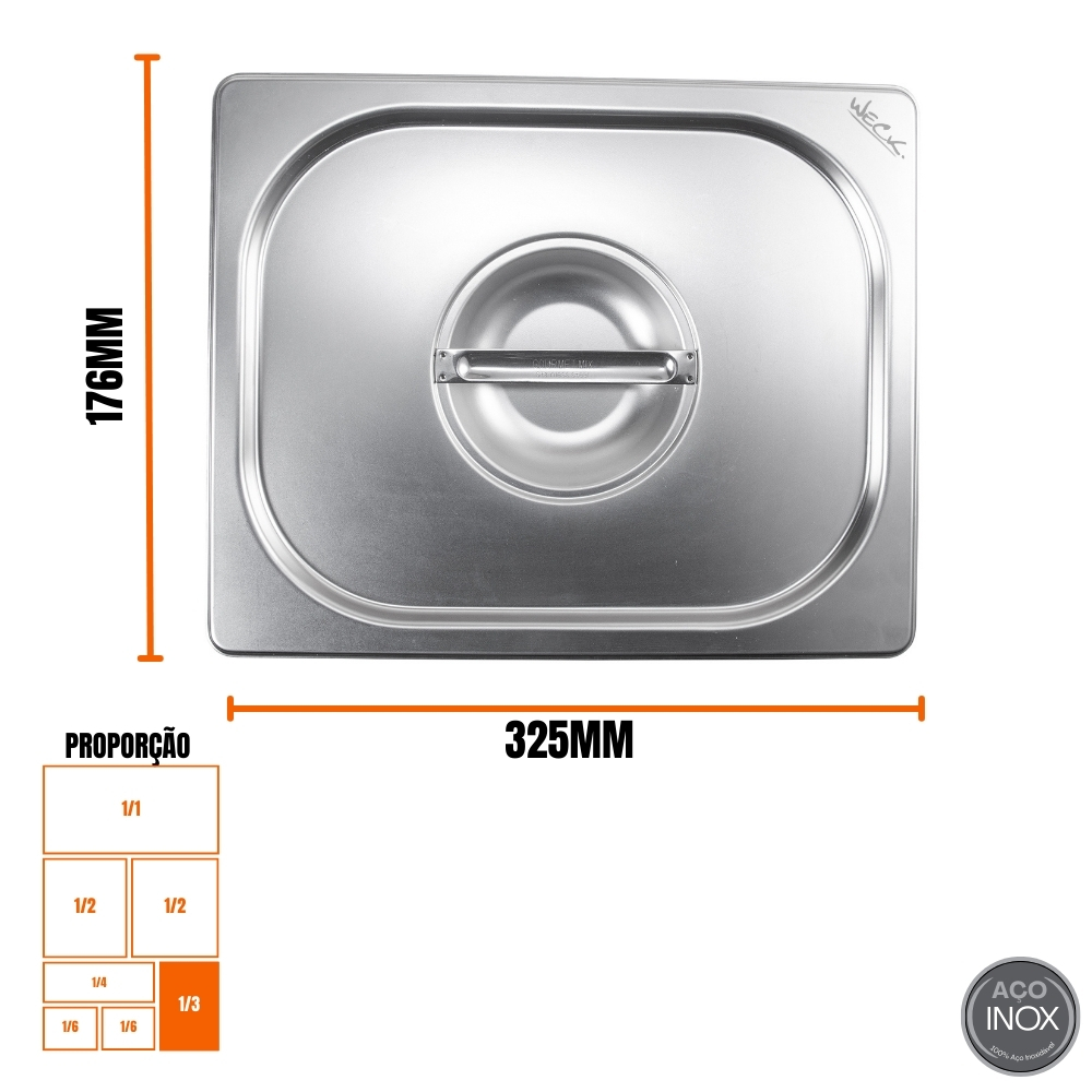 Dimensões externas: 32,5 x 17,6 cm (padrão gastronômico GN 1/3)